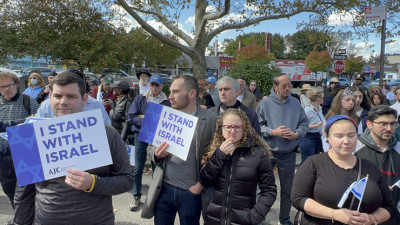 Feelings of anger, grief, and solidarity were shown by the spirits of community residents, who held Israeli flags and “I Stand with Israel” signage provided by the ADL and Shraga Teichman, a QJCC Board Member.