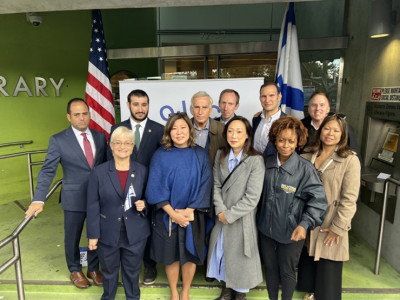 Newly-appointed State Assemblymember Samuel Berger, whose parents David and Paula were in the audience, spoke directly to his Israeli family members: “To my family there, fighting now, be safe.” His colleague Nily Rozic, an Israeli national who concluded her remarks in Ivrit, observed, “My family, my friends in Israel have been terrorized and traumatized. I have been traumatized. So many of my cousins, my family members have been fighting to keep everyone safe.”