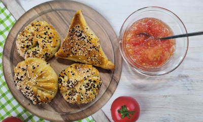 Samsa/Gozhgidzha is a savory pastry that consists of dough filled with a seasoned meat mixture, typically lamb or beef, finely chopped onions and a bit of fat. The dough is traditionally prepared in a similar way to bread dough, using ingredients like flour, water, salt, and possibly yeast or baking powder for leavening. Beechak is a triangle shaped pastry stuffed with pumpkin.