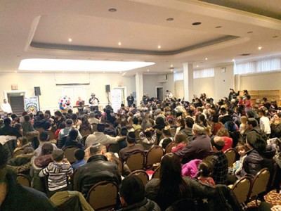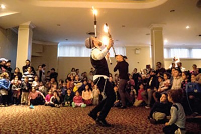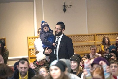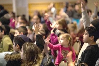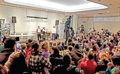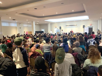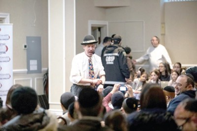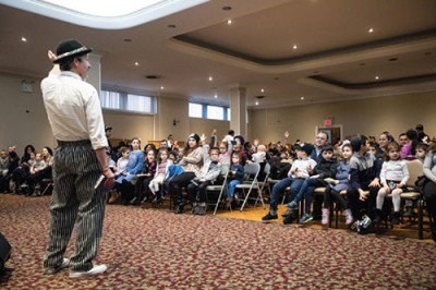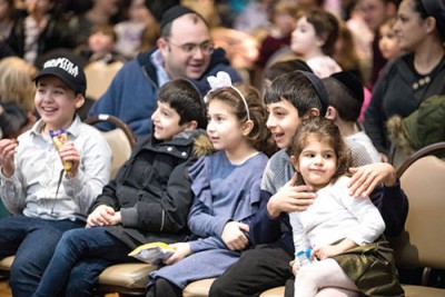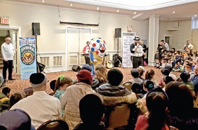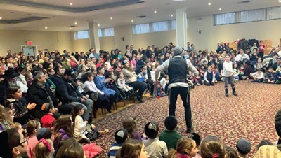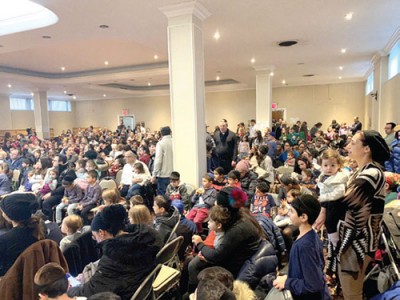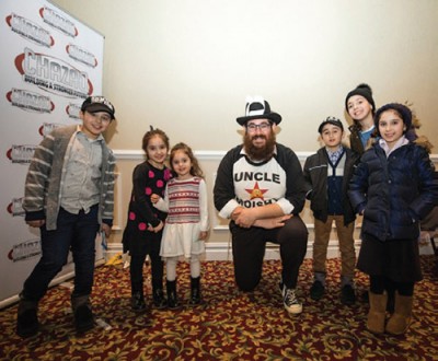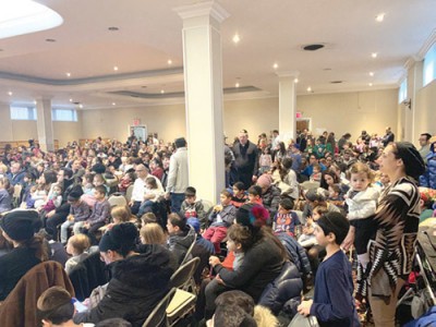 On Sunday afternoon, Erev Tu BiSh’vat, and at the start of Yeshivah Week, Uncle Moishy, Cousin Nachum, the Mitzvah Men, and the Twins from France visited us in Queens. By the time the performance began, the social hall of the Young Israel of Kew Gardens Hills was completely packed with around 500 people; the standing-room-only turnout overflowed with families. Kids sat crisscross along the perimeter of the “stage” and excitedly clapped and cheered when “everybody’s favorite uncle” bounded in, singing, playing his guitar, and bringing so much merriment to an otherwise cold and rainy day. Uncle Moishy’s friends Pizza and Ice Cream Cone added color to the show (though it turns out my daughter was afraid of the costumed characters!), illustrating some of his classic songs. Uziel Martin, who used to live in KGH but traveled to Queens with his family all the way from Highland Park, New Jersey, said, “Uncle Moishy was entertaining for me as well as my family. I enjoyed the comedy that was accessible regardless of age.” Indeed, kids of all ages, as well as adults, seemed to enjoy the show.