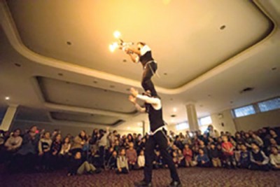 The Twins from France danced into the room halfway through the show, taking over the stage. They bounced on pogo sticks, rode unicycles, flipped, and cartwheeled, and even included their very tall (on stilts!), clumsy “grandfather” in the performance. They brought both kids and adults up from the audience to participate in their acrobatic tricks, keeping the show exciting for everyone. As always is the case with this duo, the audience laughed at their antics, was brought into the suspense of their more daring tricks, and was amazed by their skills and agility.