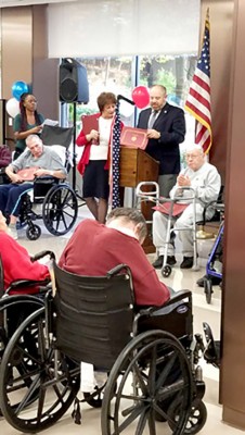 “Councilmember Rory Lancman serves the nursing facility’s district and was delighted to join the staff to recognize the 20 veterans our facility,” remarked Margaret Tietz Director of Public Affairs Linda Spiegel. Lancman spent time thanking each veteran individually and noted how “we thank you for keeping us safe and giving us the opportunity to live here in the United States of America because of your valiant efforts in times long ago.” The councilmember also recognized that “we are safer as a country because of each of the veterans’ distinctive struggles.” He continued, “Veterans Day is a time to recollect the men and women who showed up, answered the call and pledged their lives.”