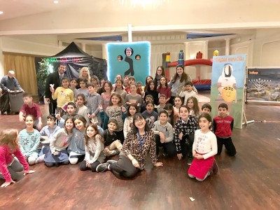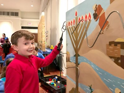 A hands on Puppet Theater where children made their own puppet shows and a book nook filled with Chanukah books, were set up for the younger children. Children were able to climb inside a huge dreidel and stick their heads out the gimmel for a unique photo shoot. A unique Chanukah buzzer game, a giant I Shpy, a life size Yehudah Macabee, a Giant Clik menorah and dreidel all added to the excitement. The children were even able to visit the Kosel!