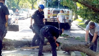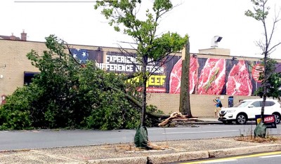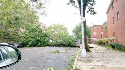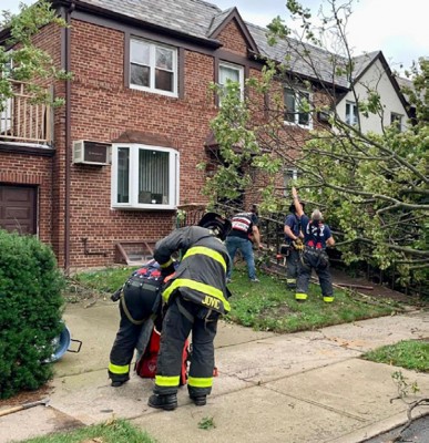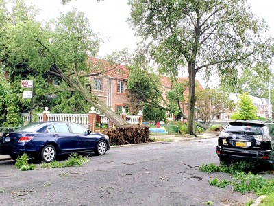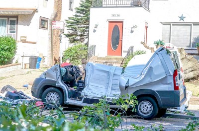 Around the tri-state area, over two million residents suffered power outages. Tragically, a commercial compact van parked in the Briarwood section of Queens, just off 84th Avenue and Smedley Street, with a 60-something-year-old man sitting in the passenger side seat, was crushed when a Pine Oak tree toppled directly on top of the vehicle, taking the man’s life – the first fatality attributed to the tornado-like winds. Queens Hatzolah and FDNY reported to the scene just after 1 p.m., where the victim was found in traumatic arrest. Hatzolah alerted its members that the area was unsafe – “trees falling everywhere,” its radio blared, according to one local volunteer. “The tree-toppling winds hurled a branch from a nearby tree through the windshield of a New York Police Department cruiser as they were responding to the casualty,” mentioned a neighbor. The man was believed to have been a construction worker at work on a nearby project and was most probably on a lunch break as chaos ensued.