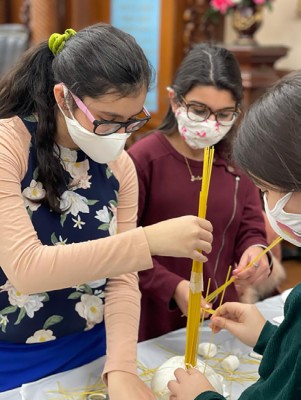 Mrs. Zerykier then introduced the activity of the night, a STEM challenge. The girls had 18 minutes to plan, ideate, and test their hypotheses. In an architectural feat, the girls were challenged to build a freestanding tower out of spaghetti sticks, tape and string and then suspend a marshmallow from the top. The tallest tower stood at 24 inches! Most importantly, it was a great opportunity for quick engineering, team building, and connection.