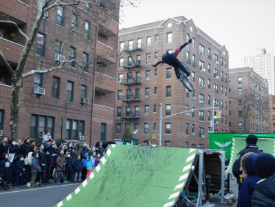 Chanukah ended with a big celebration outdoors in Forest Hills. Bicycle stunts on ramps, a DJ, the lighting of an 18-foot menorah, and hundreds of chocolate coins and mini-parachutes tossed from a 30-foot FDNY Tower Ladder were just part of Chabad of Forest Hills North’s Seventh Annual “Chanukah on the Park,” which took place on Sunday, December 5. Hundreds attended, many of them children.