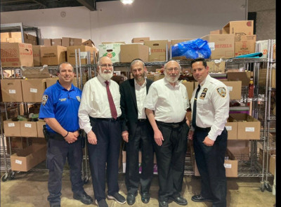 On Wednesday, June 8 a meeting of the minds was held at the Kew Gardens warehouse of the longstanding community stronghold Tomchei Shabbos of Queens. The gathering welcomed Captain Jeremy Kivlin, the recently appointed commanding officer for the local 102nd New York City Police Department precinct (pictured far right). In attendance were Police Officer Scott Adelman, Community Affairs for the 102 (far right); Rabbi Daniel Pollack, clergy liaison to the police station; and Rabbis Aharon and Yitzchok Katz, the dynamic father-and-son team that run the daily operations of Tomchei Shabbos of Queens.