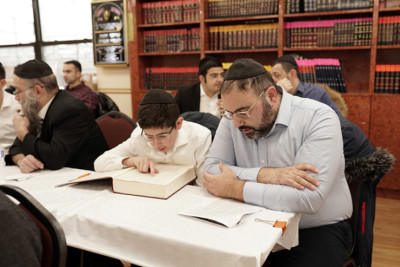 For some, New Year's Day is just another day off from work, but for the fathers of Yeshiva Tiferet Tzion (YTT), it is a day to spend precious time with their son's in yeshivah! On Sunday, January 1, the fathers of YTT talmidim arrived shortly after 10 a.m. to a warm welcome from the hanhalas ha'yeshivah. As their fathers enjoyed light refreshments, the YTT bochurim made their way to the beit ha'medrash, g'morahs, notes, and learning packets in hand. Within minutes, the kol Torah of fathers and sons learning g'morah, Rashi, Tosfot, and other mefarshim permeated the walls of the spacious beit ha'medrash. It was truly a sight to behold. Rabbi Moshe Lehmann, ninth grade rebbe, delivered a shiur and recap of the learning. This was followed by words of chizuk from HaRav Ilan Meirov, guest speaker.