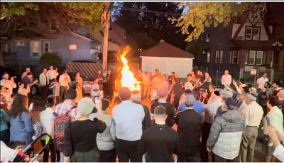 A large crowd gathered around the bonfire in front of the Young Israel of Briarwood and basked in the warmth and light of the bonfire. Lively music filled the air as men danced in circles around the bonfire and sparks lit the sky.