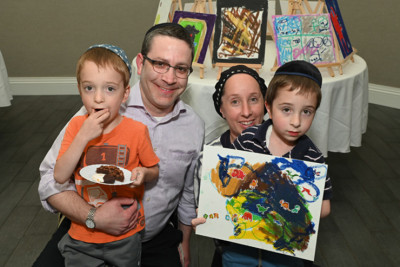 As I scanned the exhibition, I found unique expressions jumping off each canvas. I found the pieces to communicate the feelings of the youngsters, as they visualized various concepts, depicting the beauty and essence of art therapy. Moreover, each pallet empowered the artist to truly be himself or herself. Such is the work of SINAI Schools, where alternative means are sought for the young students to express themselves. One student used stickers to convey his thoughts, while another was offered bubble wrap and blue paint to create clouds, and yet another chose cotton balls to create a similar effect on his pallet. Some drew their homes, while others chose their favorite sports. There were a number of vibrant rainbows, and a beach depiction, lots of flowers, abstracts, and even a Magen David incorporated into a floral design to show some Jewish pride. The gift box bows, mixed with colorful Styrofoam bits and more, was a truly creative feature. All in all, the weeks spent in preparation for the exhibit paid off handsomely with smiles, love, and some great donations.