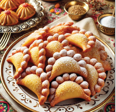 A beautifully arranged plate of Gosh-e Fil, a traditional Bukharian dessert for Purim. These crispy, golden-brown fried pastries are shaped like eleph.webp