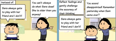 When kids say, “I never get to play with the blocks!” or “She always gets the marker color that she wants!” we can reflect their feelings and gently remind them of the accuracy of their thinking: “You sound upset. Remember yesterday you built a huge tower with the blocks that you knocked down!”